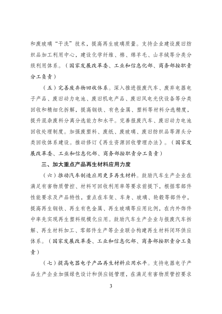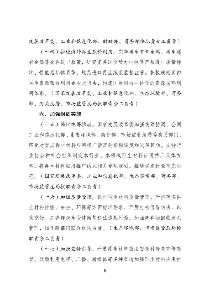 為全麵貫徹黨的(de)二十大和二十屆(jiè)曆次全會精神,認真落(luò)實黨中央、國務院決策(cè)部署,加強再生(shēng)材料應用推廣,完善廢棄物循環利用體係,促進循環經濟發展,國家發展改革委、工業和信息化(huà)部、財政部、生態環(huán)境部、商務部、海關總署、市場監管總局等部門製定了《再生(shēng)材料應用推廣行動方案》。現(xiàn)印發給你們,請認真(zhēn)抓(zhuā)好落實。